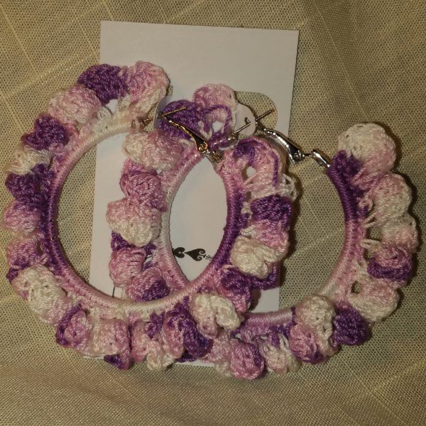 Beautiful, hand made ruffled crochet 50mm hoop earrings in shades of purple and white!