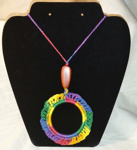 Beautiful 13" Rainbow crochet chain that slides over head, adorned with wooden bead.